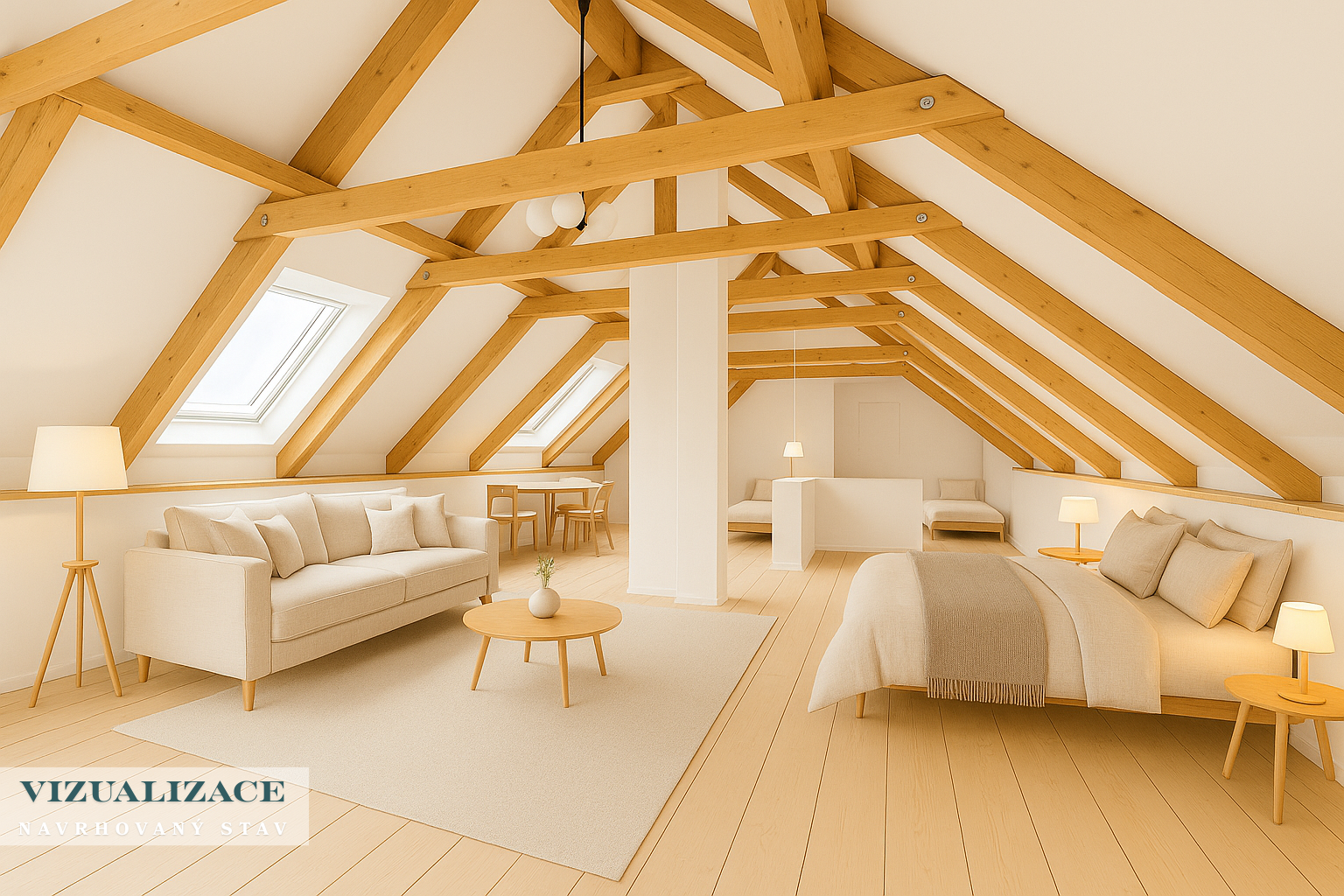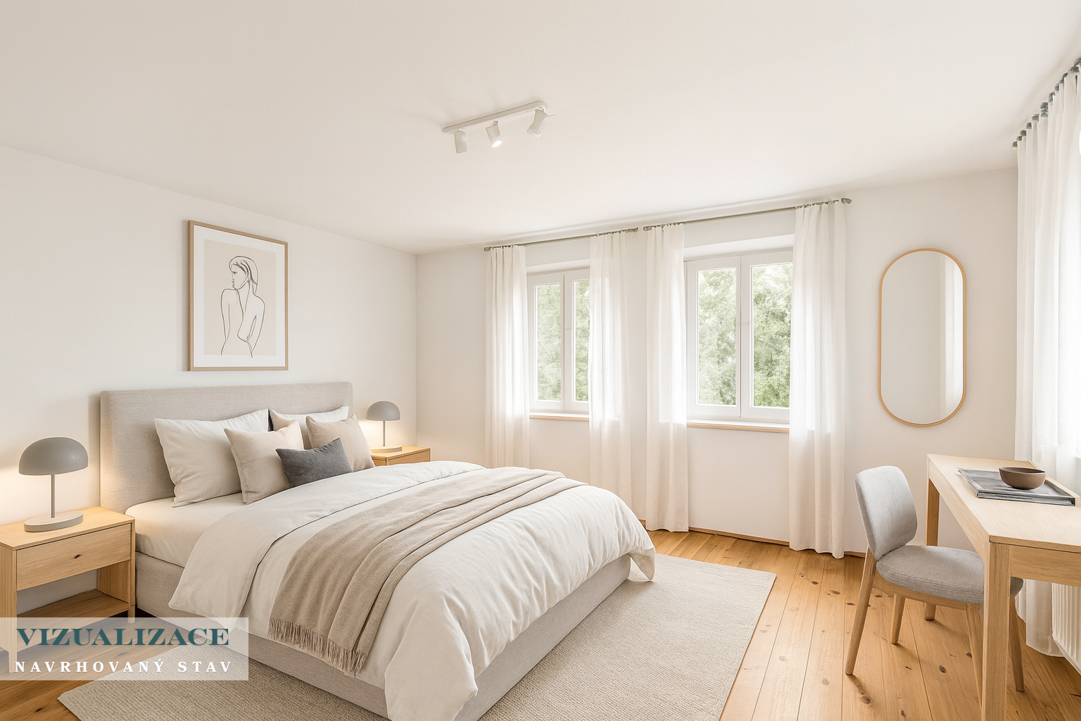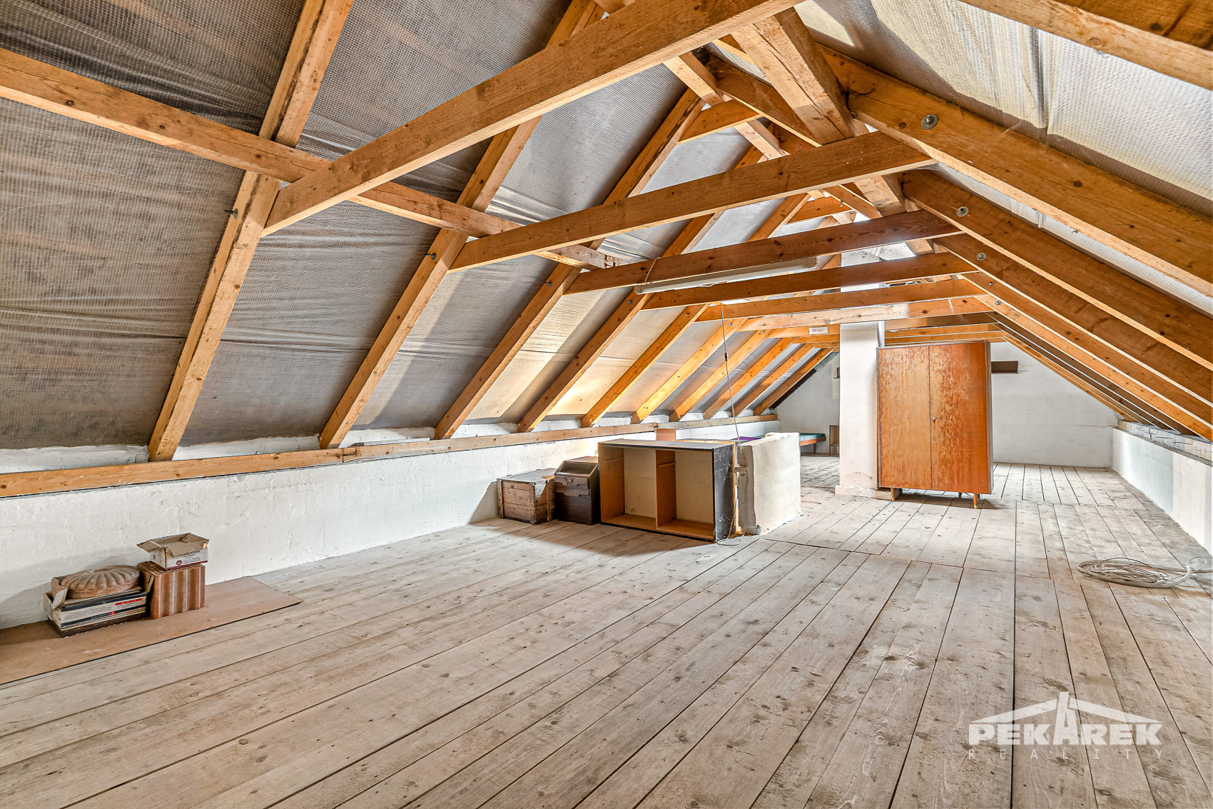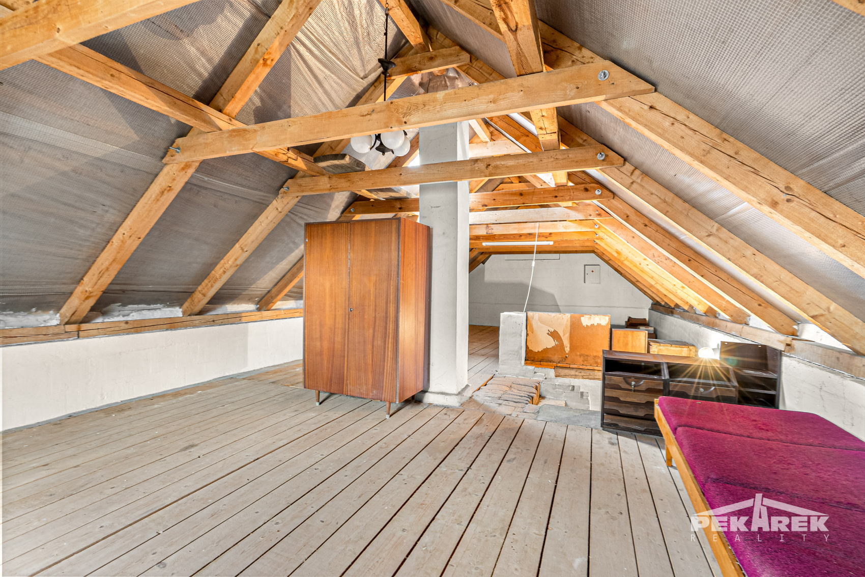 V patře najdete dva samostatné pokoje, které lze využít jako ložnice či pracovny. Velkou výhodou domu je rozsáhlé podkroví, které nabízí potenciál k vybudování další obytné části nebo útulného ateliéru. Pro ty, kdo hledají dům k rekonstrukci, poskytuje tato nemovitost opravdu široké možnosti.